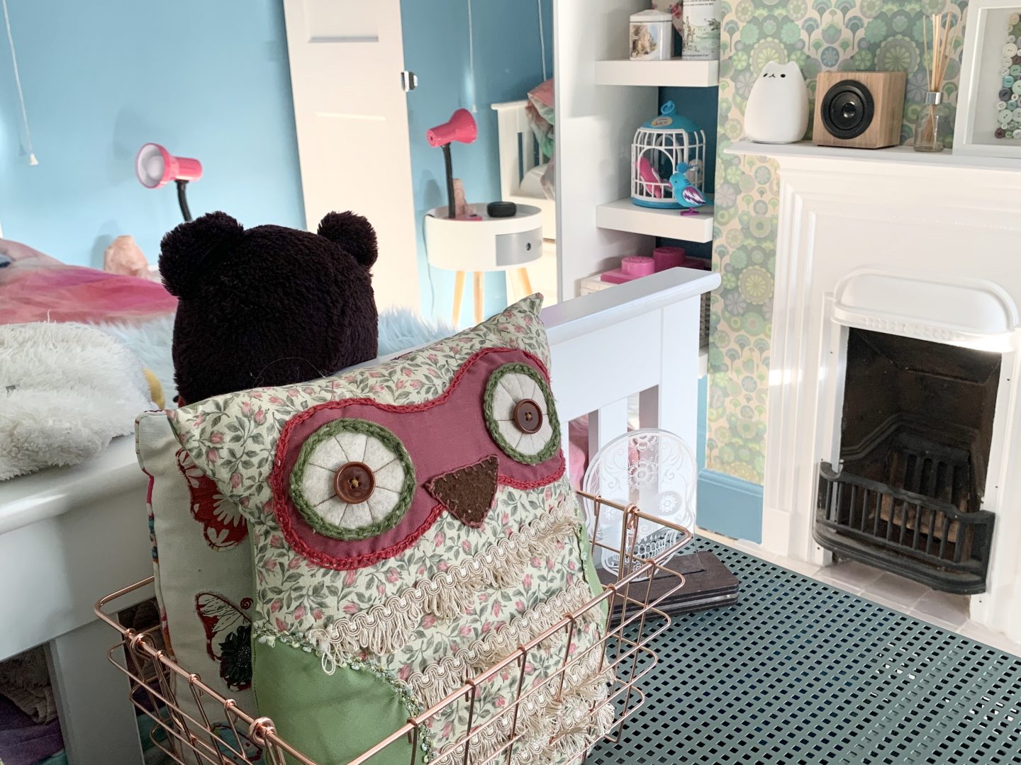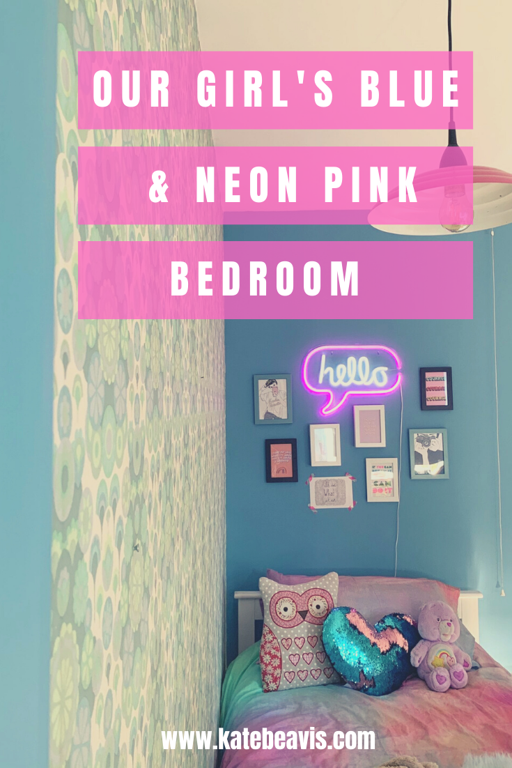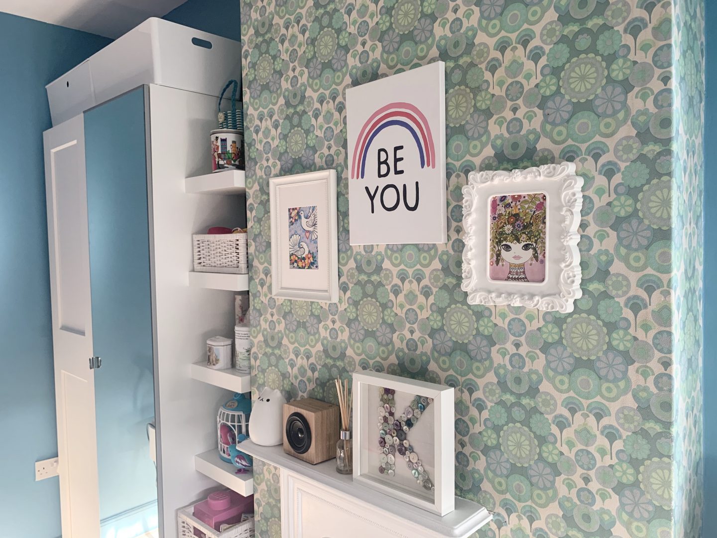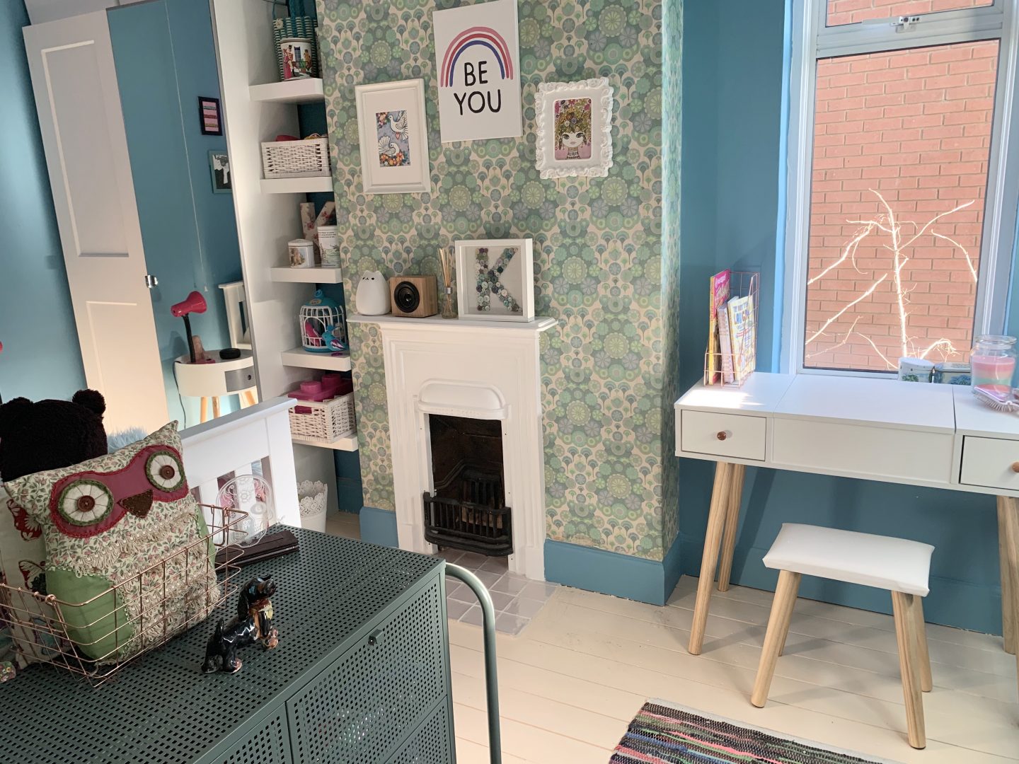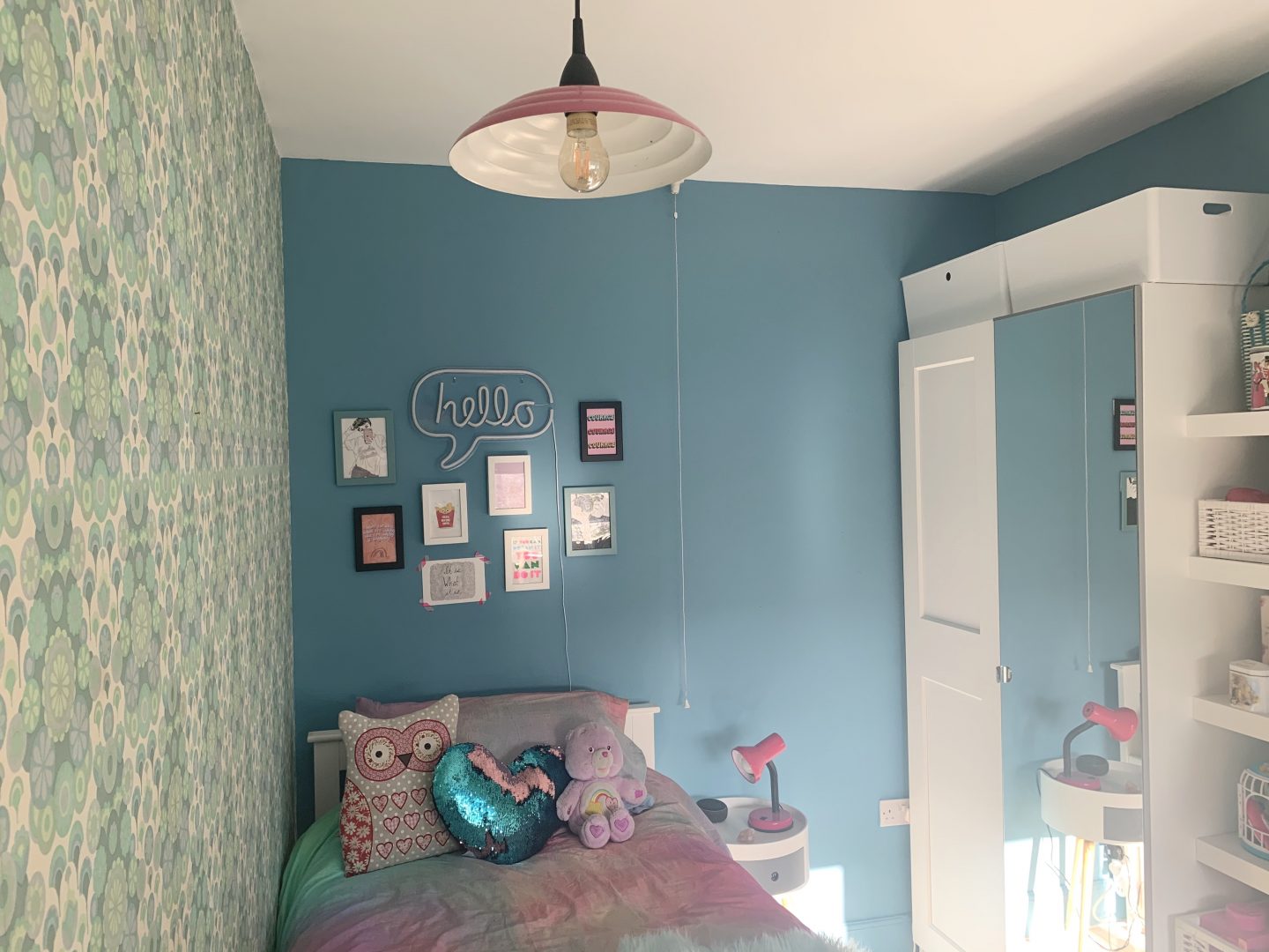 But hey, life moves on and so does the taste of my daughter. One rule that I made for the room though is that the vintage wallpaper had to stay. It has been there since the 1960s and we love it (Kitty doesn’t) but as this room may one day be the spare room, we agreed that it should stay. We decided to pull out one of the colours in the pattern to use on the walls which she was adamant had to be blue. We teamed up with the team at Valspar Paint who gifted us the paint and chose their Blue Chiffon colour. As you can see we have painted the skirtings in the same colour after trialing this in our lounge. It makes the walls feel taller as they have not been broken up by the classic white skirting that we all feel that we should do.