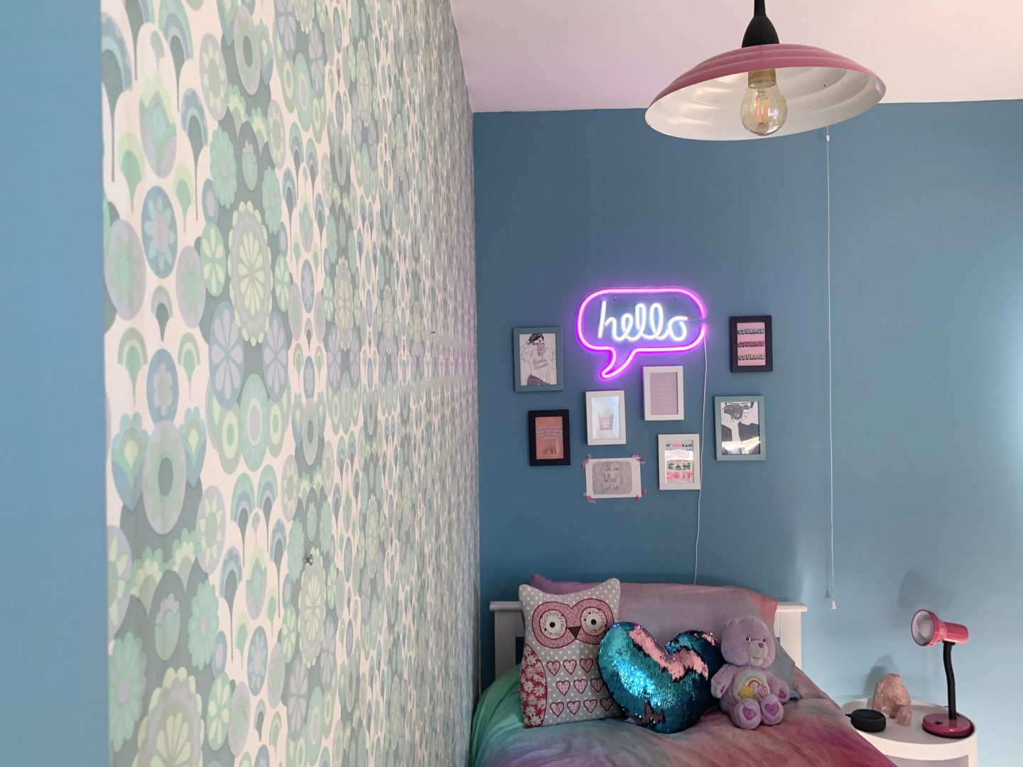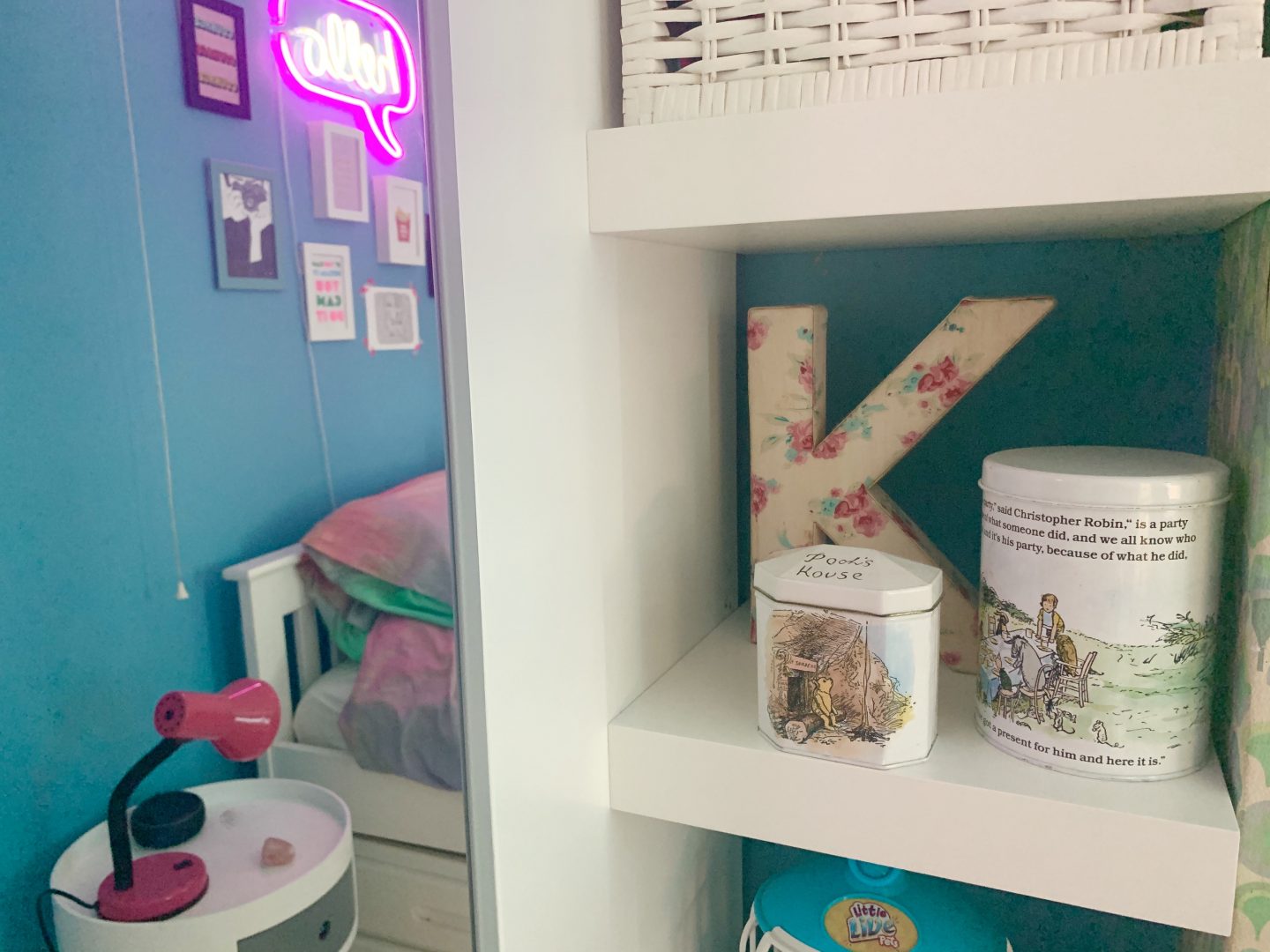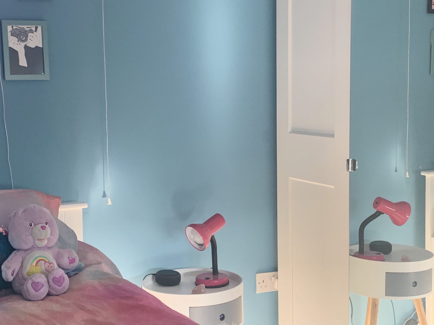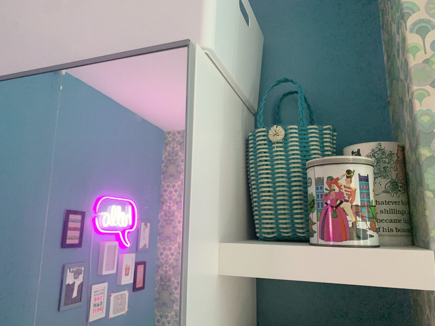 But hey, life moves on and so does the taste of my daughter. One rule that I made for the room though is that the vintage wallpaper had to stay. It has been there since the 1960s and we love it (Kitty doesn’t) but as this room may one day be the spare room, we agreed that it should stay. We decided to pull out one of the colours in the pattern to use on the walls which she was adamant had to be blue. We teamed up with the team at Valspar Paint who gifted us the paint and chose their Blue Chiffon colour. As you can see we have painted the skirtings in the same colour after trialing this in our lounge. It makes the walls feel taller as they have not been broken up by the classic white skirting that we all feel that we should do.