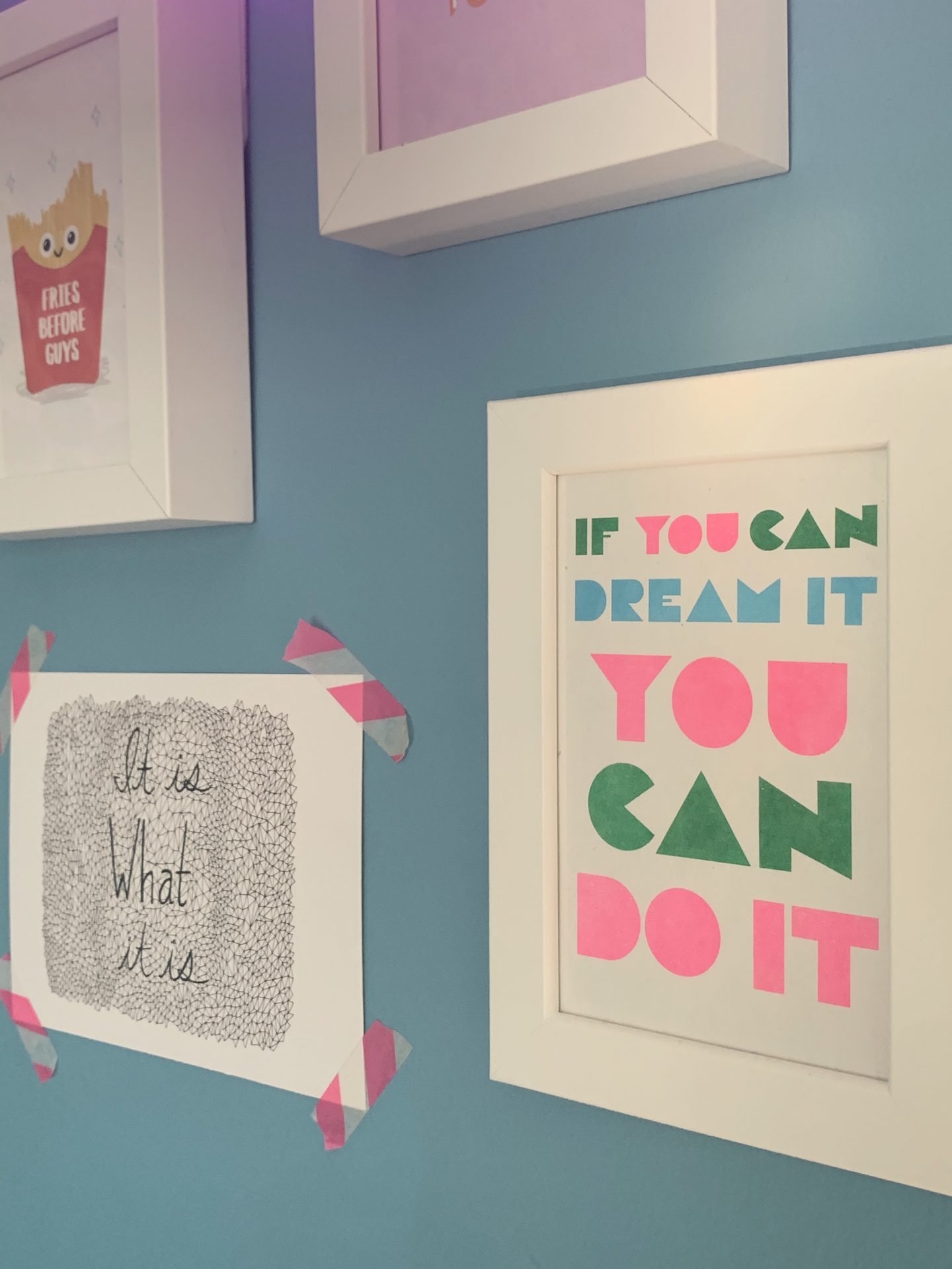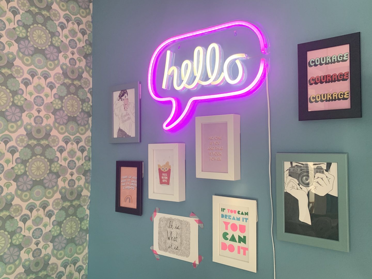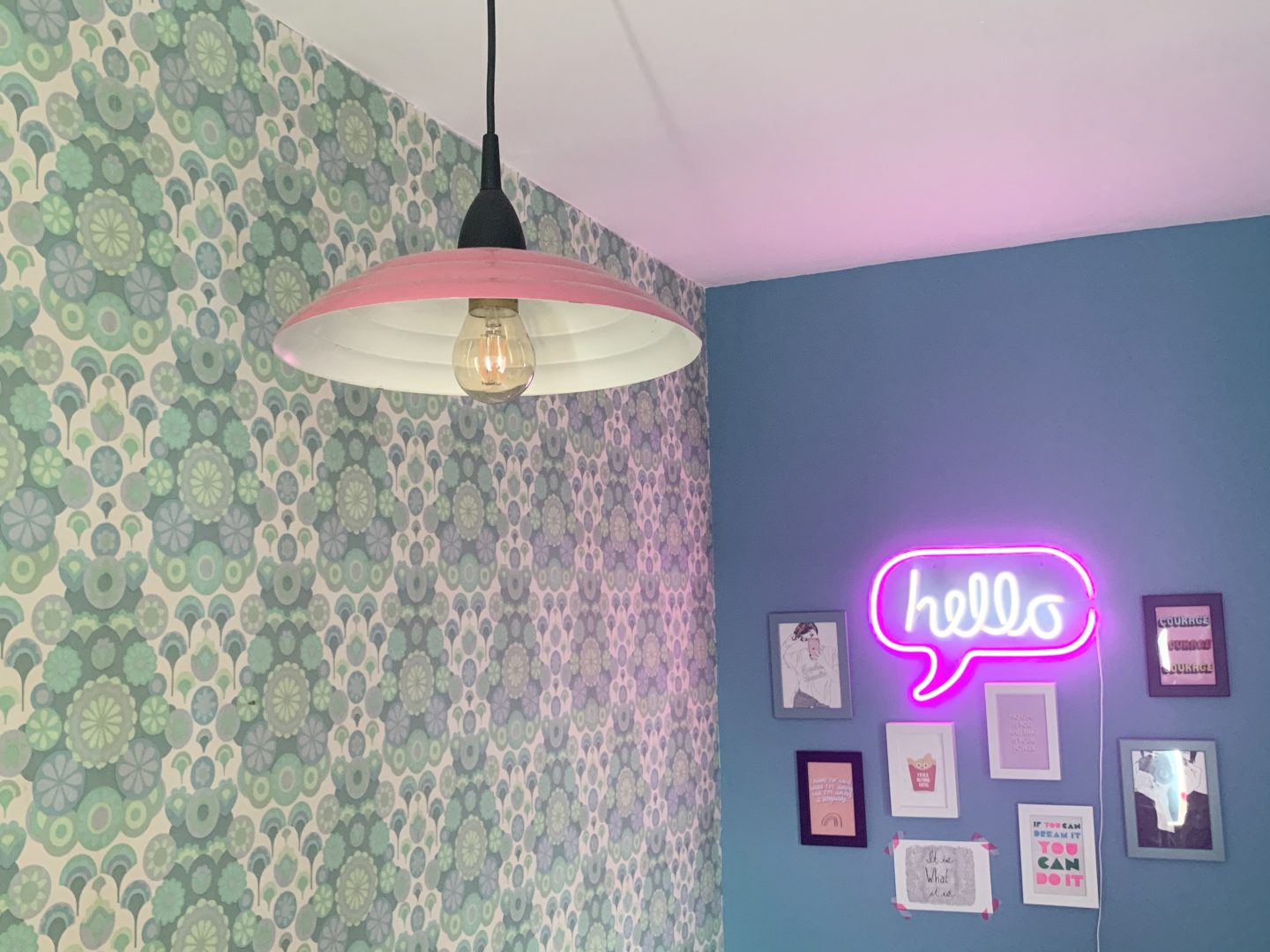Finally we created a collage of inspirational feminist quote postcards bought from Etsy. Kitty chose them and Fries Before Guys is her favourite – a mantra that we can all believe in no matter what our age! The cards are by A Spoonful of Sugar Co, Bagging Around , L Walker Illustration and Emmy Lupin Studio. The neon sign adds another splash of colour and fun.