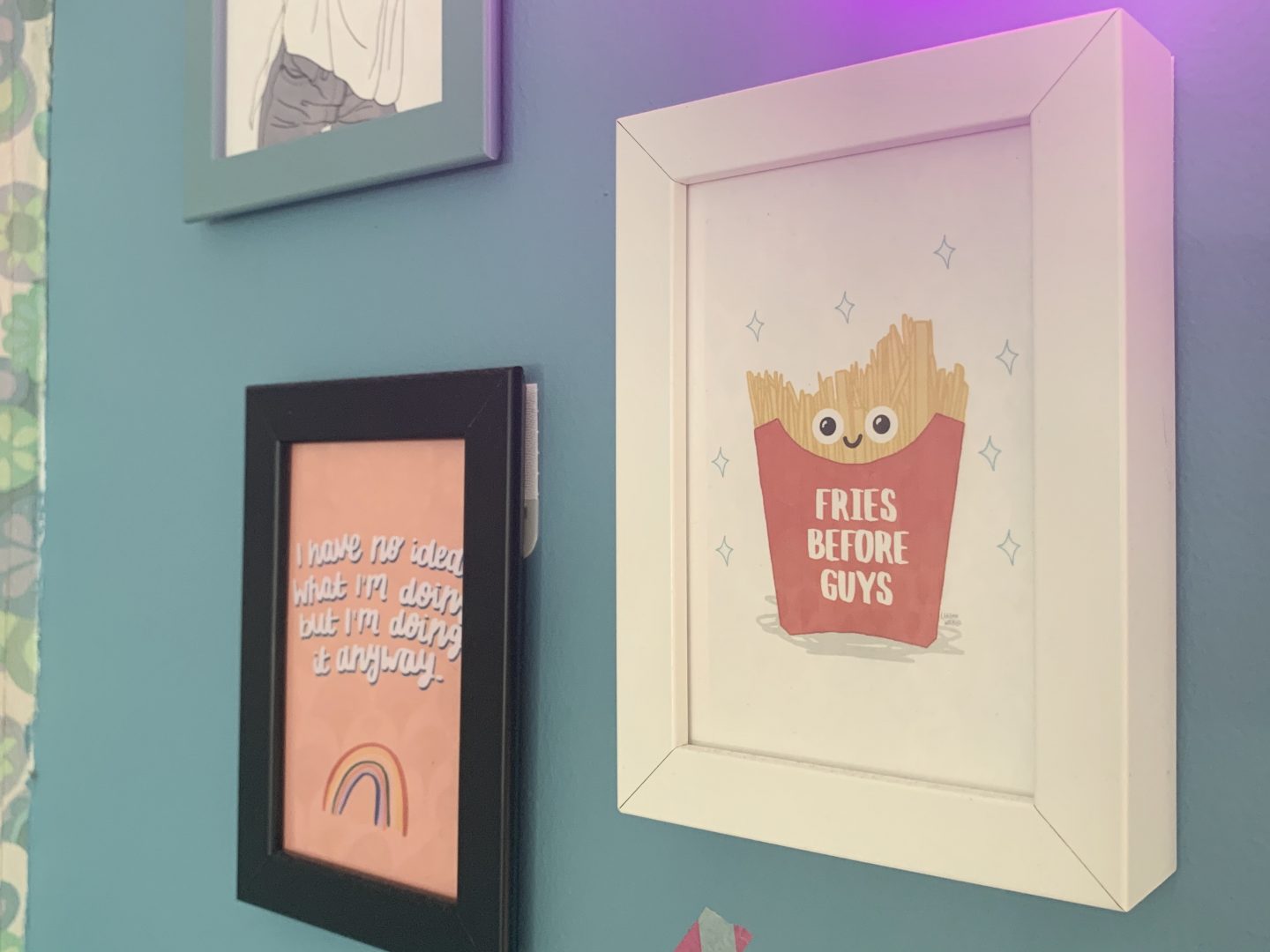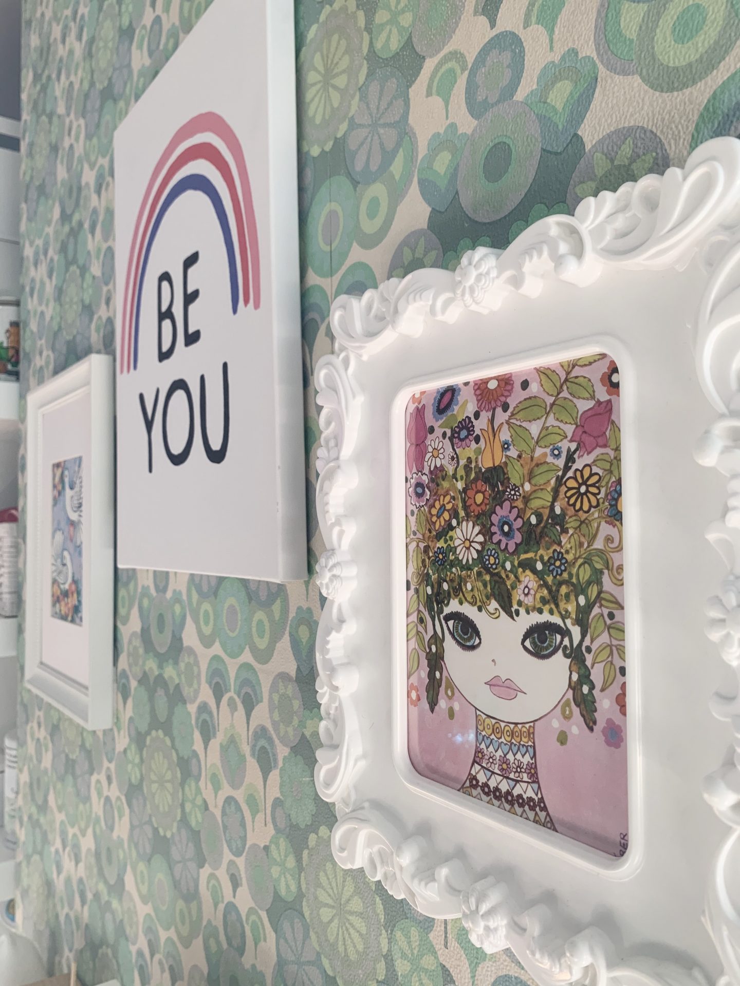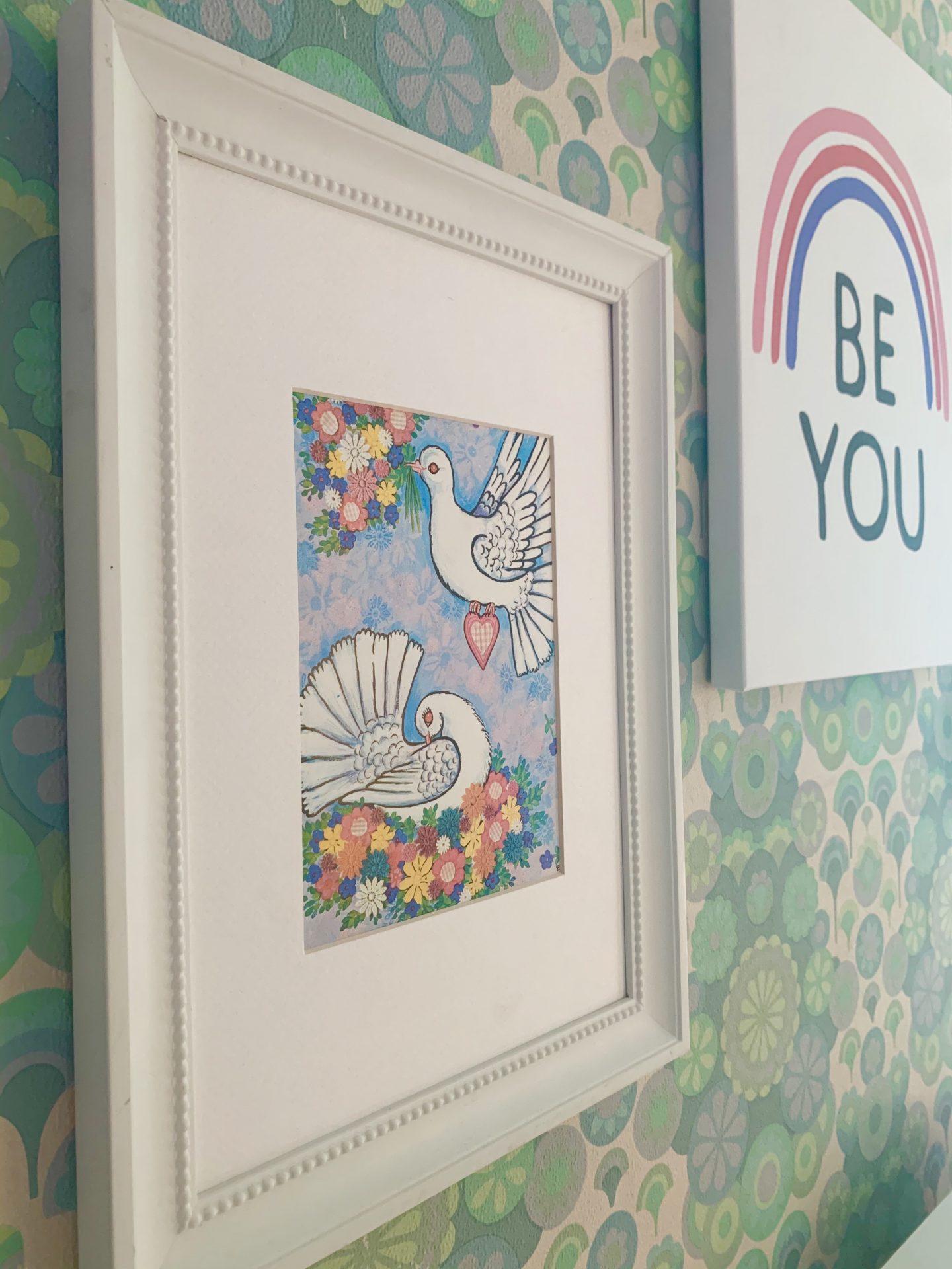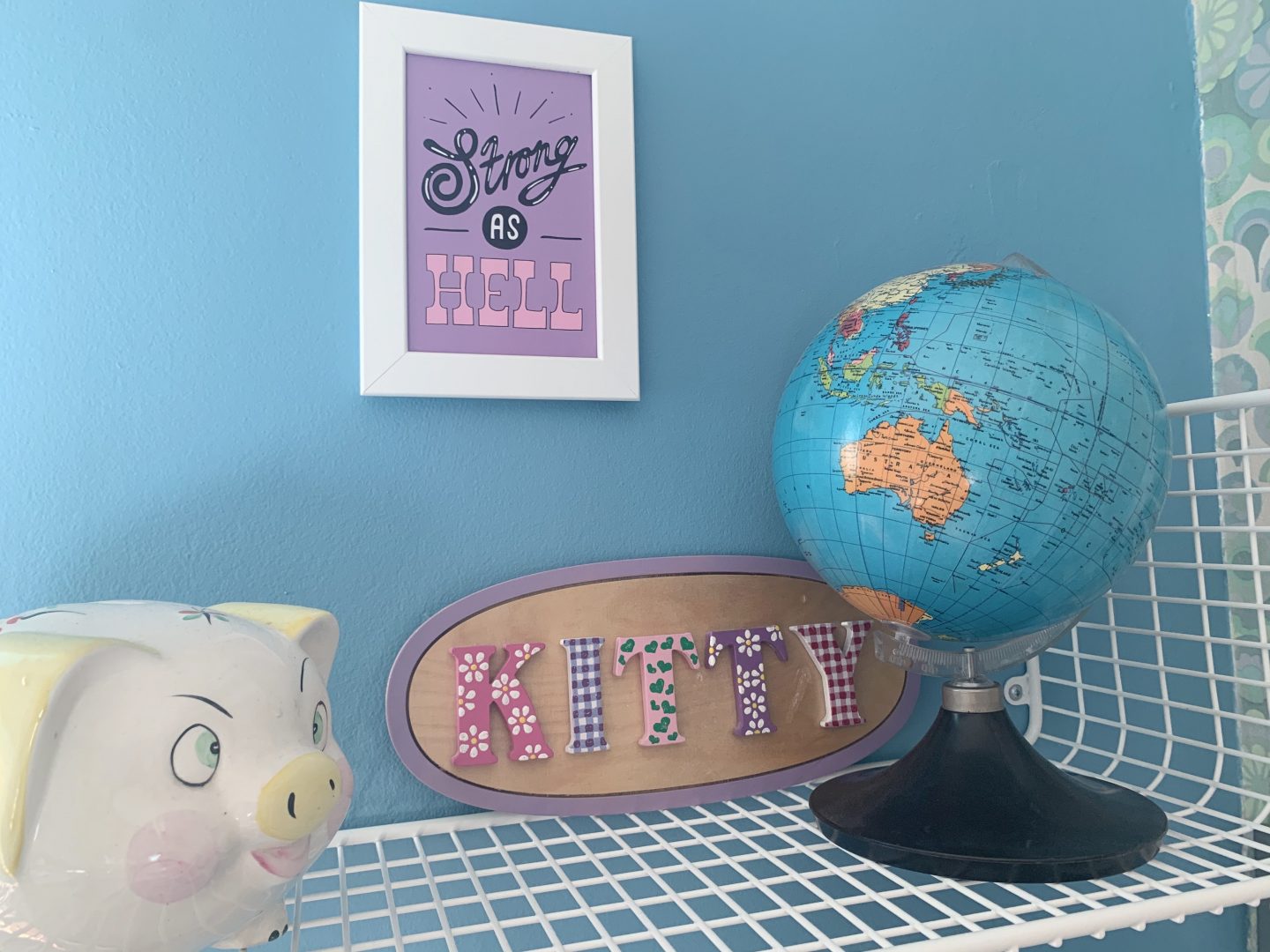 Finally we created a collage of inspirational feminist quote postcards bought from Etsy. Kitty chose them and Fries Before Guys is her favourite – a mantra that we can all believe in no matter what our age! The cards are by A Spoonful of Sugar Co, Bagging Around , L Walker Illustration and Emmy Lupin Studio. The neon sign adds another splash of colour and fun.