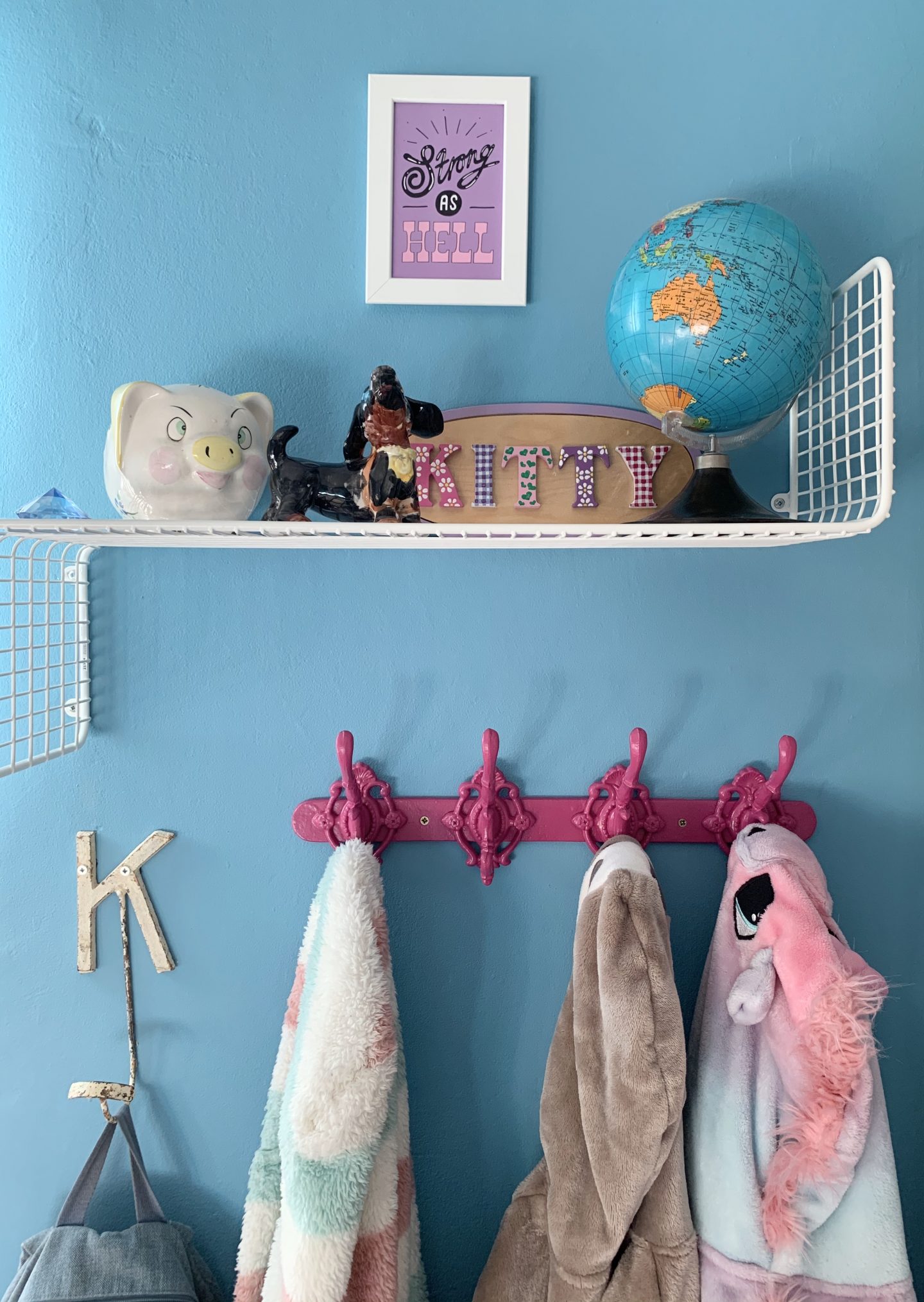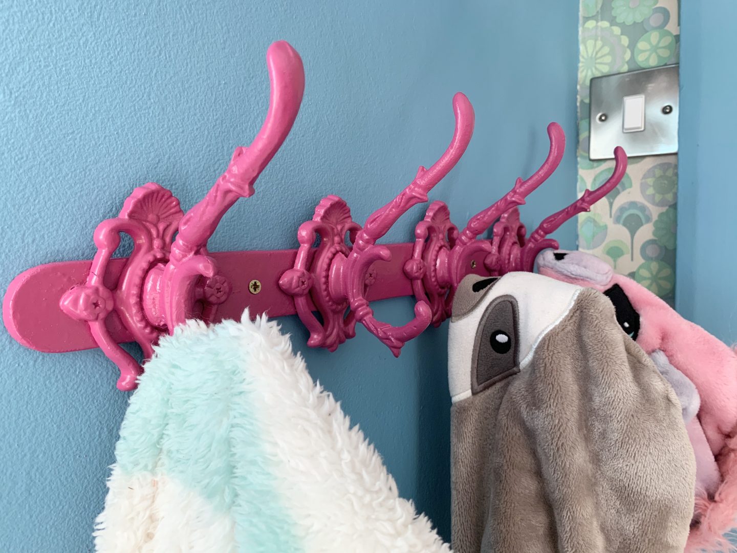 We spray painted a set of vintage hooks bright pink too.