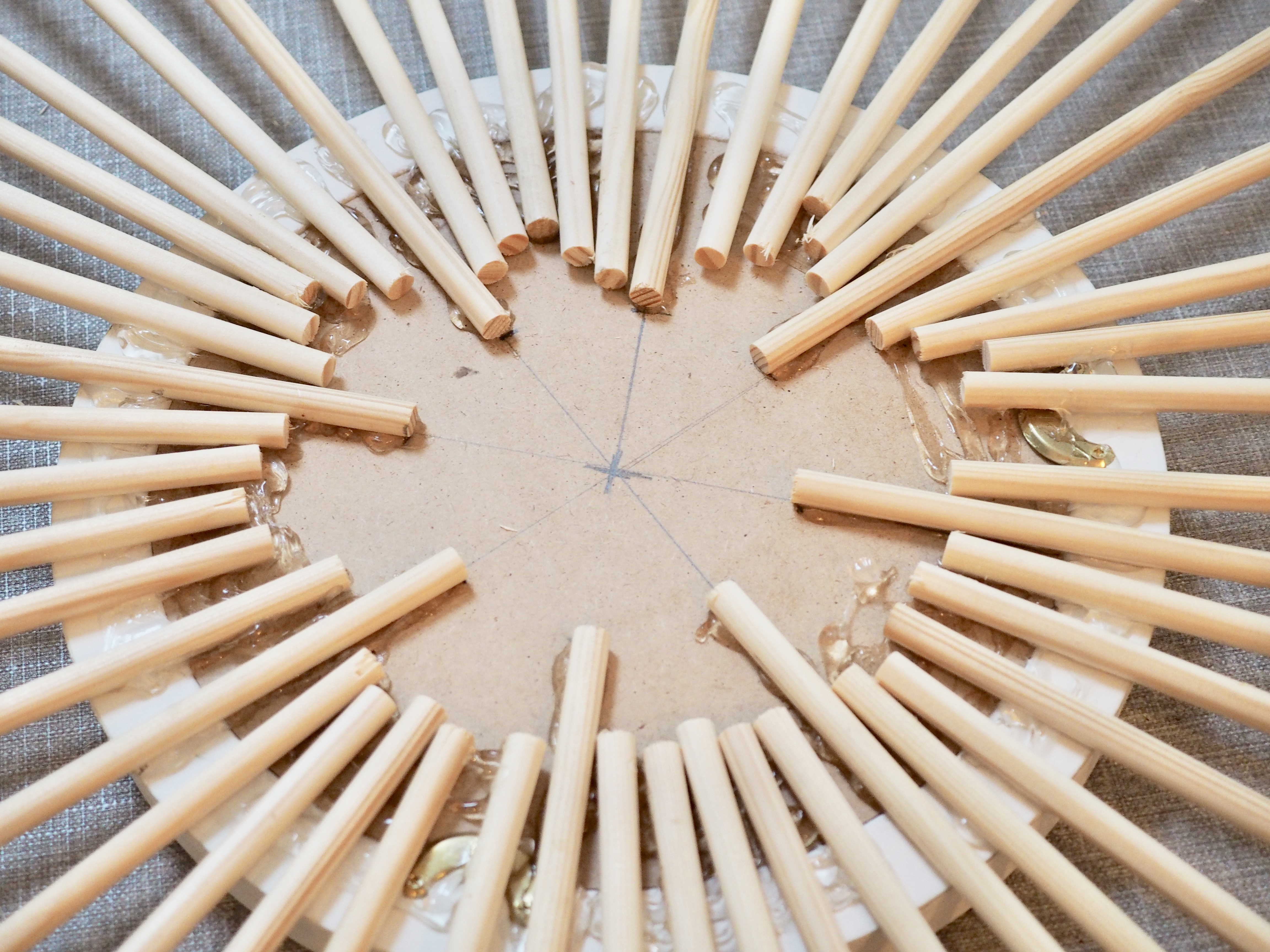 Step 3: You will now need to cut the dowels into lengths. Depending on your design the lengths will vary. I cut 8 longer sections of 33cm, 16 x 24cm, 16 x 20cm and 8 x 17cm. However you design your spikes to sit, make sure you have aprox. 8cm of length more than needed so it can be fixed securely to the back of the mirror.