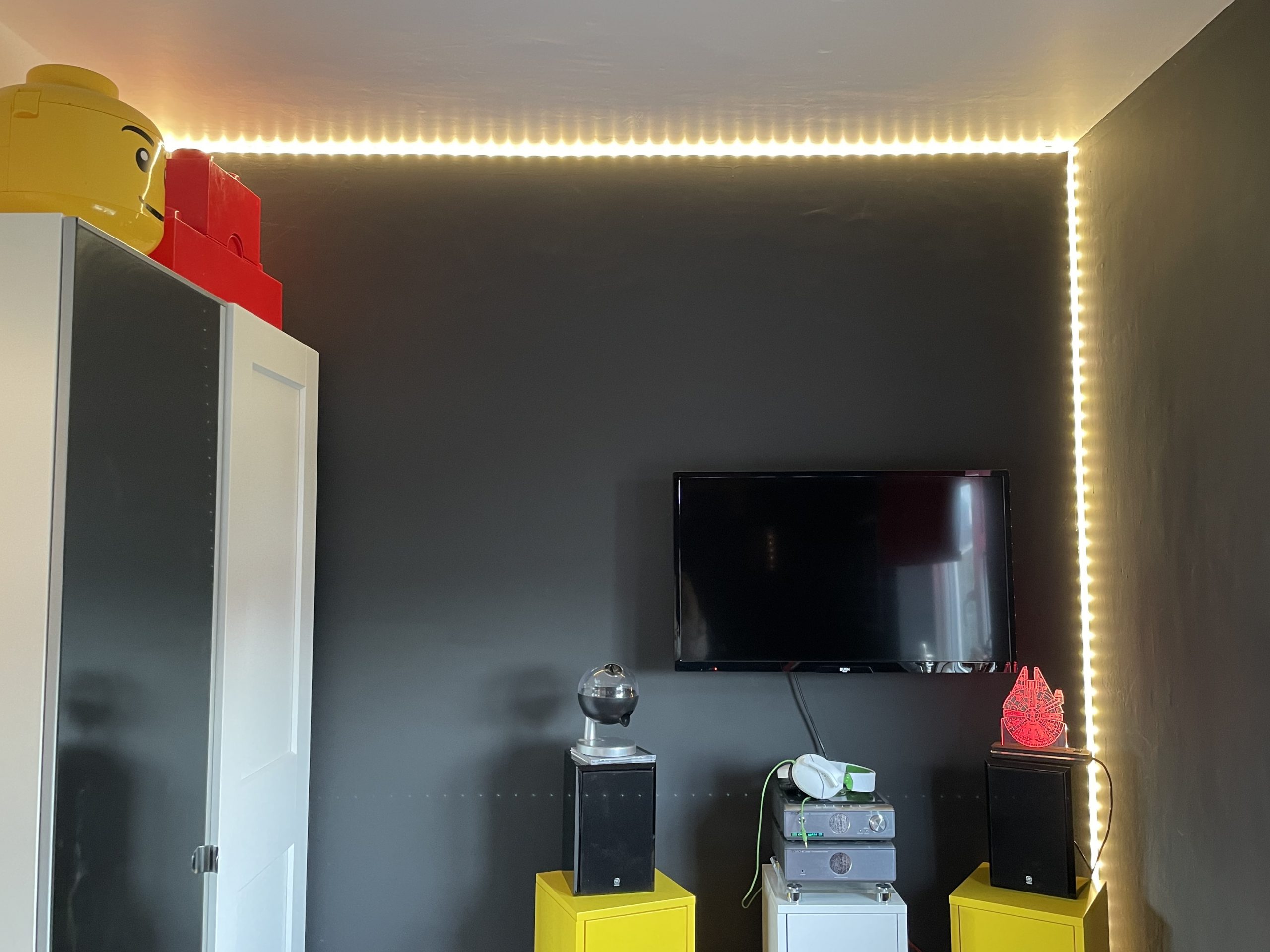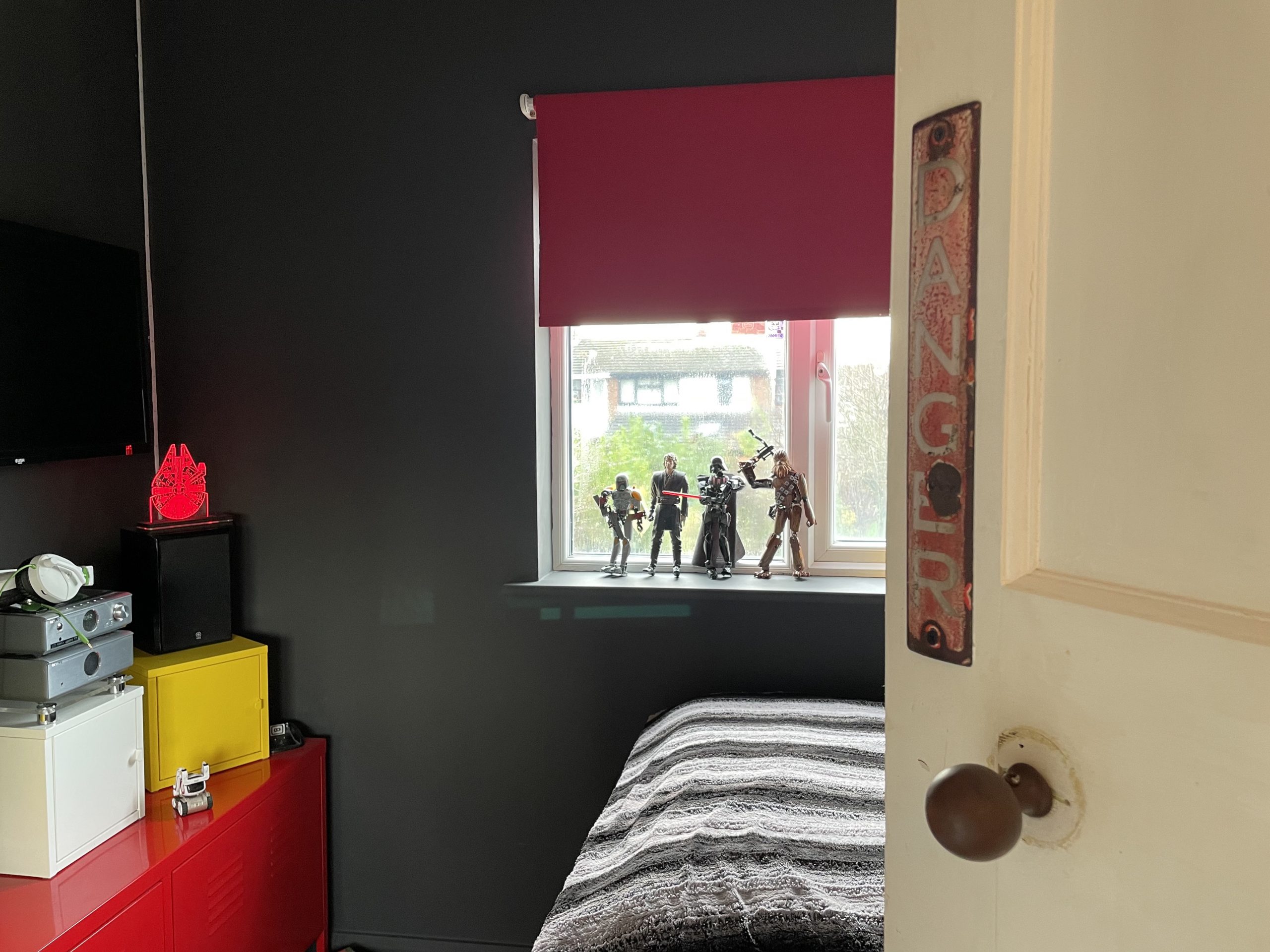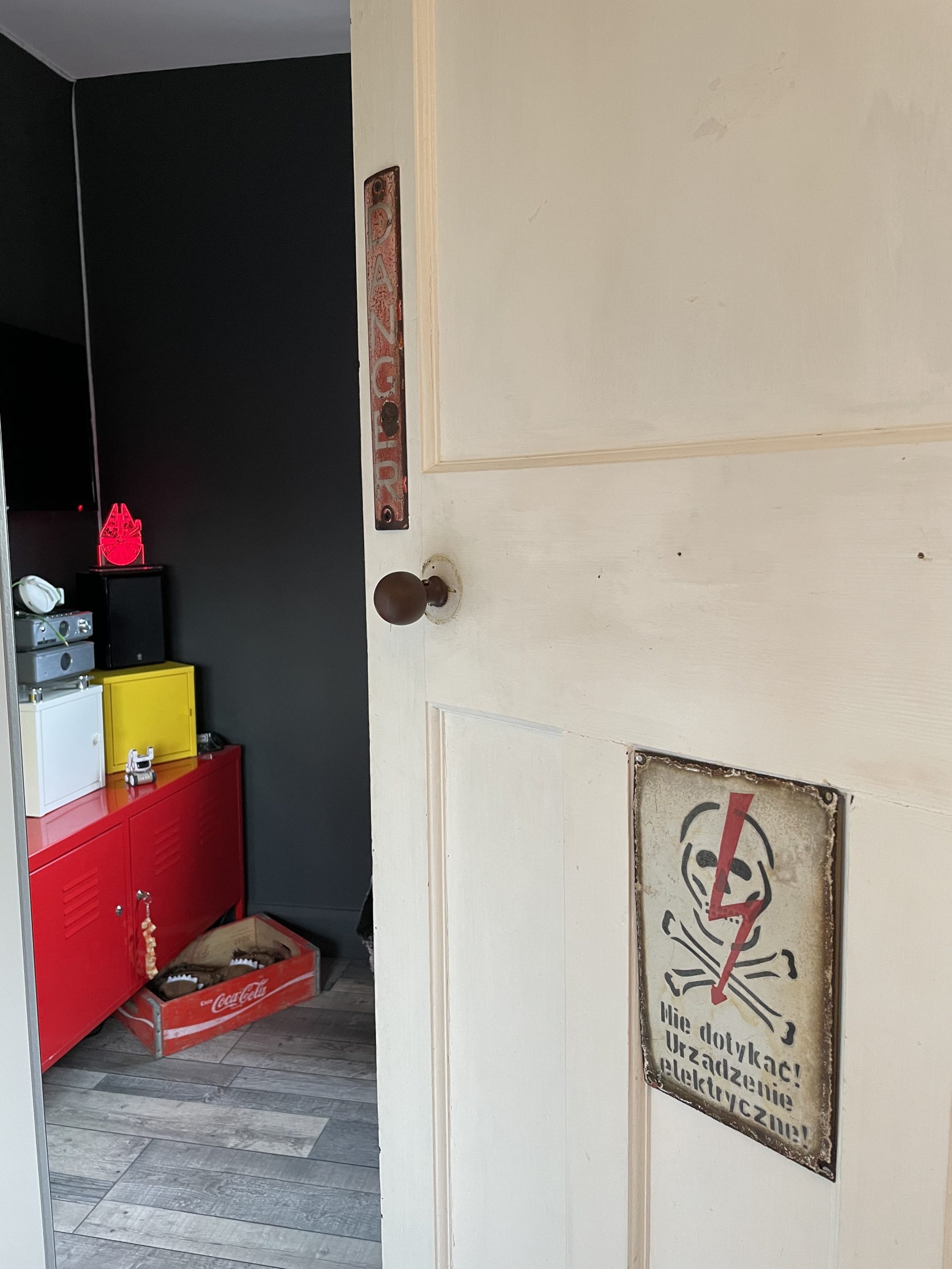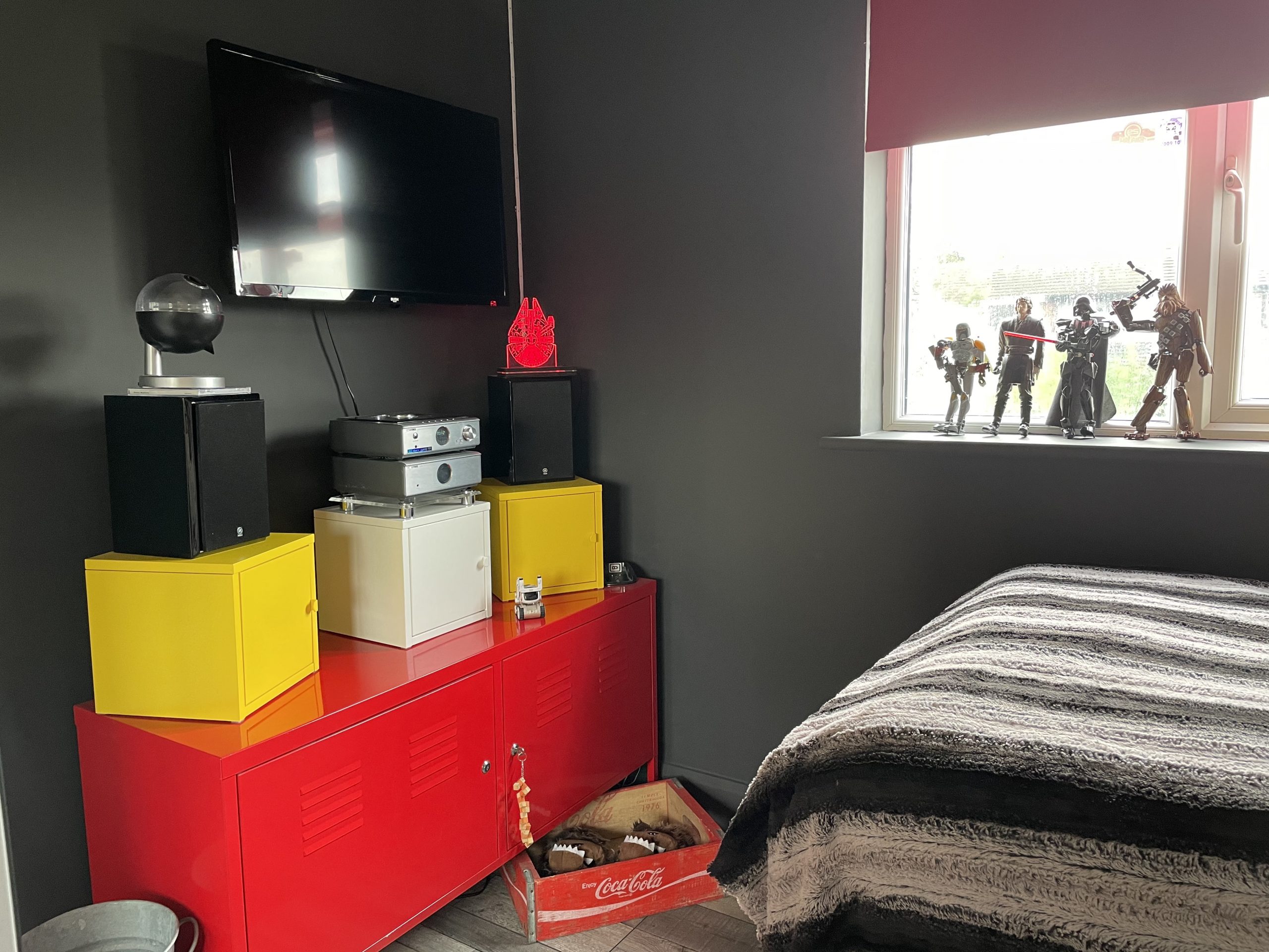 It turns out a 12 year old doesn’t need much “stuff” preferring tech over tat! We kept up the old rusty signs on his door (the skull sign we found in a Polish flea market last year) and added a metal pin board from IKEA and his favourite Yungblud poster. Anyone that has a tween/young teen knows it is all about the LED strip lights so the tech wall has these around the edges. It looks fab when it is dark!