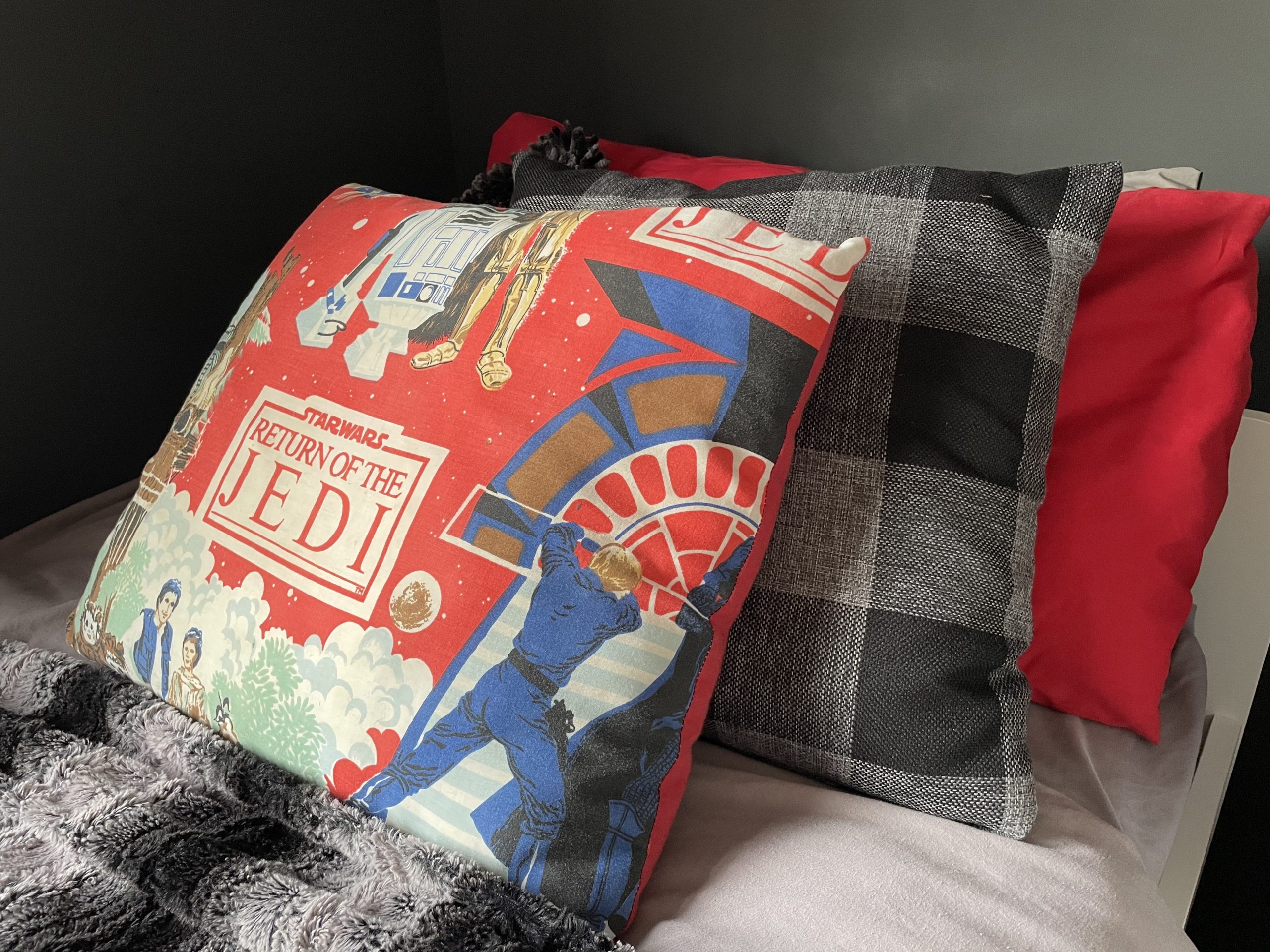 I convinced him to paint the giant vintage letters in reds, blacks and greys which he agreed to. The bedside table is a vintage industrial set of drawers which is perfect for him to keep all his small bits and pieces in. The lamp is a 1990s Anglepoise which is here until he finds a light he prefers. The last piece of vintage is a the retro fabric Star Wars cushion which is more sentimental than anything. Oh and the shade is 1960s. So basically as you can see, I didn’t totally listen to the no vintage rule!!