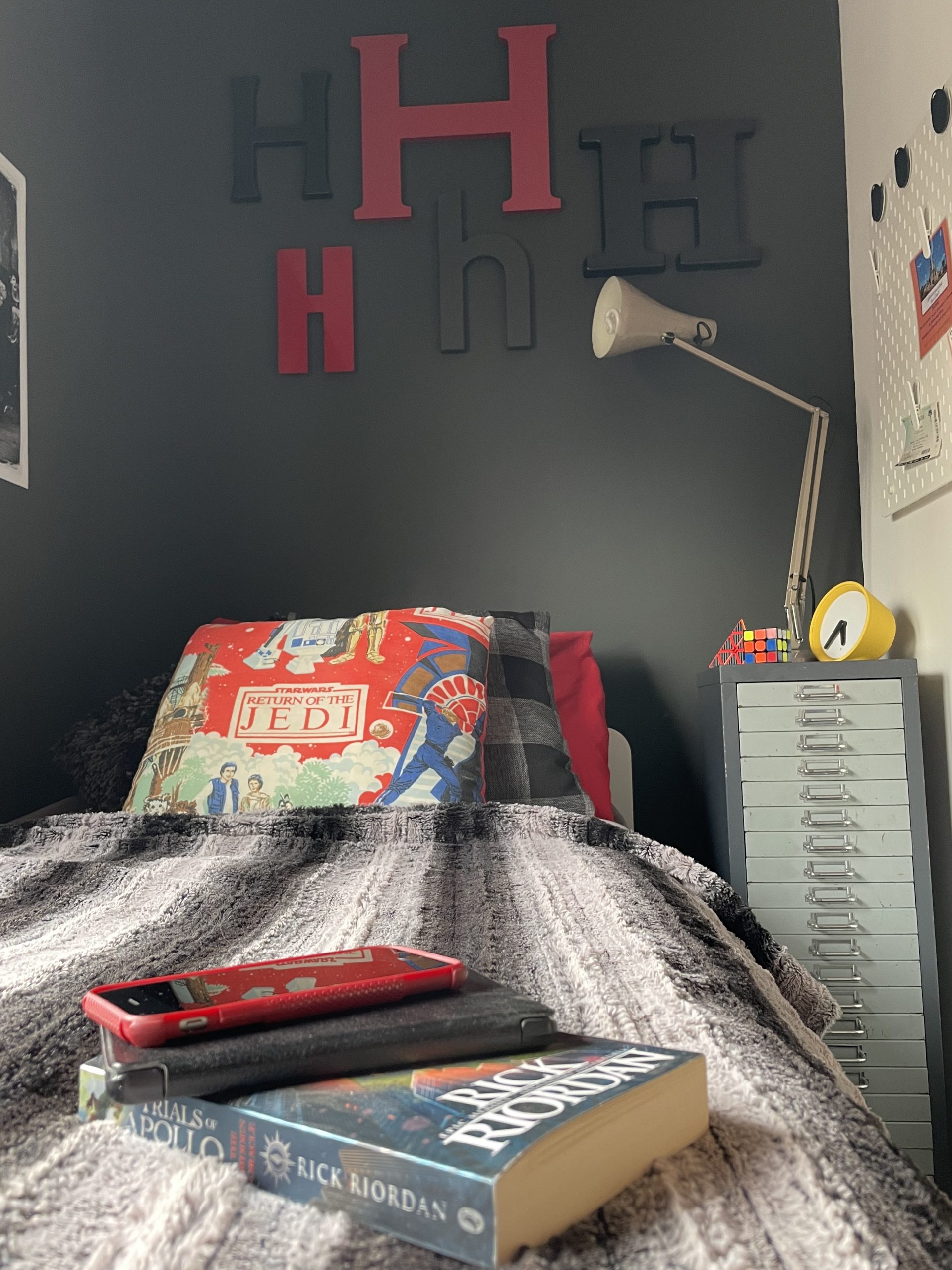 Our son has wanted a new look room for so long; having turned 12 his last bedroom felt too young (it was decorated when he was 7). The main issue was the cabin bed that he had grown to hate, wanting instead a bed on the floor. But the room is small, so we had put off the change for a long time, feeling a bed would take over the room. All changed in Lockdown, when he turned 12; all he wanted to do was watch TV in bed so of course floor space didn’t matter! His only ask, on top of a bed on the floor was that he wanted the walls black. Black! I refused (even though I spent many years as a goth as a teen myself!) and settled on a dark grey paint. Huge thanks to Annie Sloan who once again stepped in to offer us her graphite wall paint (gifted) which is the perfect colour for our boy’s room and as near to black as I was willing to go!