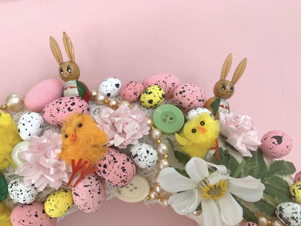 I first made this Easter wreath a few years ago but pinned everything into place, so that it could be redesigned in the future. But every year I pulled it out of the box (along with the vintage lamb and Easter decorations) only to find it was falling apart. So while in lockdown today we decided to redo it , and took photos to show you! It is made up of old vintage bits and pieces as well as egg and chicken decorations bought a few years ago from a pound shop.
