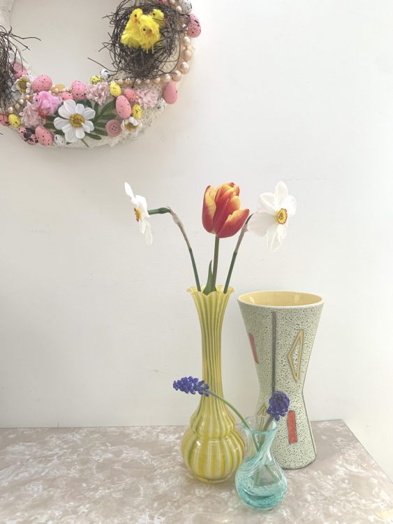 And that’s it – simple and looks really cute with our vintage lamb and vases of handpicked flowers from the garden.